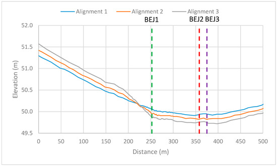 In Figure 13, the location of all three examined BEJs along the alignments is depicted. The most critical BEJ, close to which many accidents were localized, is BEJ1, which is in a sag section (Figure 13).