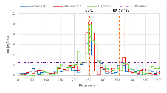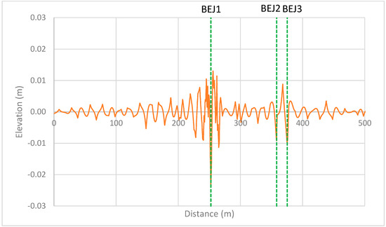 In the examined portion of the road, a rotation of the carriageway takes place, and BEJ1 is placed in correspondence with the transition curve, while the other two (i.e., BEJ2 and BEJ 3) are located in the circle arc. Applying a high-pass Butterworth filter with cut-off spatial frequency equal to 0.05 cycles/m (wavelength of 20 m) to the three 500 m-long alignments, it was found that the most significant irregularities were placed in correspondence to the three BEJs compared to the elevations in the remaining part of the pavement profiles (Figure 14).
