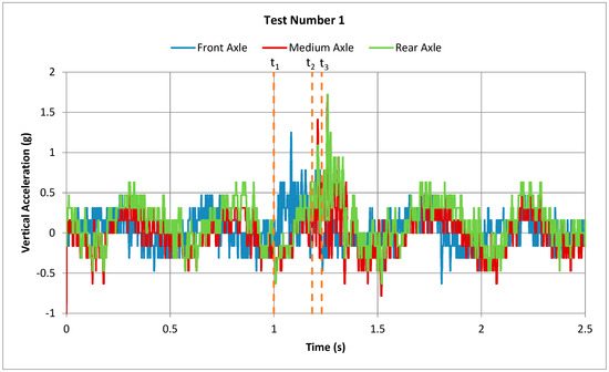 Figure 16 shows the recorded accelerometer signals provided by the accelerometers on the front, medium and rear axles (number of tests = 1), with the indication of the three bump axle times. Positive peak values higher than 1 g were found for all of the test vehicle’s axles, confirming the loss of tire/pavement contact due to the passage on BEJ1.