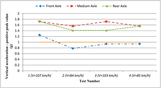 Analyzing the maximum positive vertical accelerations obtained for each configuration test (Table 2), it was found that the medium axle was the most critical one (Figure 17). In addition, Figure 17 highlights the importance of the moving speed: increasing the vehicle velocity results in an increment of vertical acceleration on vehicles and passengers.