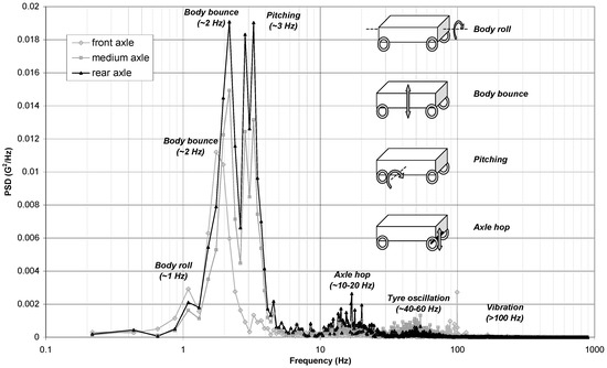 All of the collected data were also analyzed in the frequency domain, and the results were represented using the acceleration power spectral density (PSD) function. This procedure permitted studying the principal oscillation and vibration components of the vehicle due to the bump (Figure 18).