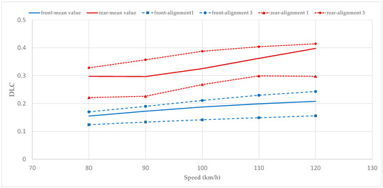 Figure 19 also reports the DLC mean value for both front and rear axles calculated considering all three alignments. A major dispersion (referred to the DLC mean value) was found for the rear axle, probably caused by the mechanical parameters considered.