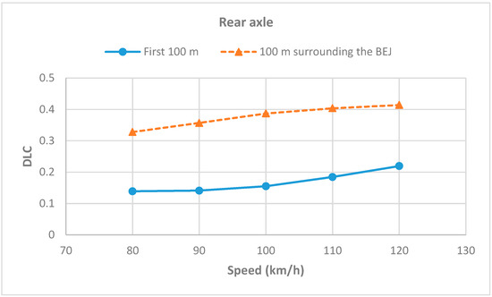 In this sense, several simulation analyses were performed using the linear quarter-truck model described in [32] to estimate the dynamic load increment for the heavy vehicles’ characteristic speed range running on the examined road (i.e., 80–120 km/h). The results of the simulation analyses (Figure 19) show higher DLC values, increasing vehicle speed in analogy with literature studies [34,37]. The DLC calculation was performed considering just a limited segment having a total length of 100 m: 50 m before and 50 m after the BEJ1.