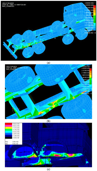 Heavy vehicle stress (MPa) at 90 km/h: (a) full vehicle, (b) magnification of medium and rear axles and (c) magnification of front axles.