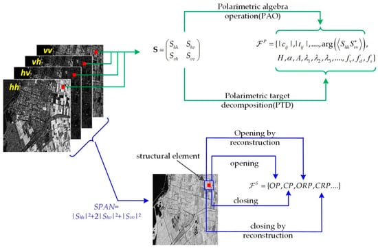 The scheme for polarimetric and spatial feature space construction in polarimetric synthetic aperture radar (PolSAR) images. The polarimetric features are concerned with the ground scattering property at a single pixel, while the spatial features are concerned with the relationship between neighboring pixels by using structural elements with different shapes and sizes.