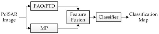In this section, the polarimetric and spatial features are used for making feature fusion based on the traditional method for classification of PolSAR images. Figure 2 shows the processing flow of PolSAR image classification with a feature fusion scheme.