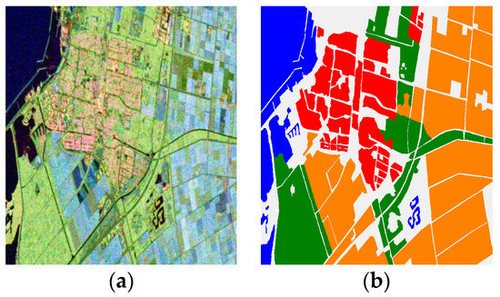 Flevoland data set collected by RadarSat-2. (a) RGB image obtained by Pauli decomposition. (b) Reference map. A total of four classes are identified. Color-coded class label: red—building area, green—woodland, orange—farmland, and blue—water.