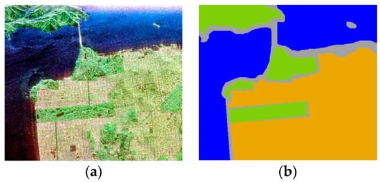 The second data set regarding San Francisco Bay is comprised of NASA/JPL AIRSAR L-band PolSAR data. The size of the image is 900 × 1024. In Figure 4a, the color image obtained with Pauli decomposition is shown. This image is manually labeled with three classes: city, vegetation, and water. The obtained reference map is shown in Figure 4b, in which different colors stands for different land cover types. Similar to the Flevoland data set, we randomly split pixels into the training set and the testing set. Detailed information about the training and testing set is listed in Table 4.