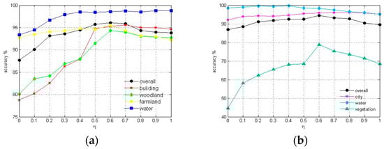 In the training process, the overall accuracy curve in Figure 5a reaches the top when . So, we may conclude that set in Flevoland data set can make the best performance. Similarly, in Figure 5b, setting in San Francisco Bay data set had best outcome. Therefore, we set in the experiment for the Flevoland and San Francisco Bay data sets.