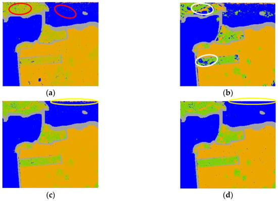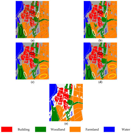 As expected, we can see Figure 6a that, regarding polarimetric features alone, the building area and woodland area in black ellipses show large variation, i.e., pixels of the same land cover type may have very different scattering mechanisms, while pixels of different land cover types may have very similar scattering mechanisms. Moreover, in Figure 6b, morphological features alone may also lead to incorrect classification results, e.g., those two farmland areas in white ellipses that are classified as woodland area. Further, feature fusion via vector stacking also has some flaws; e.g., in Figure 6c, the farmland in yellow ellipses shows obvious variation. However, when combining those two features via composite kernels, the performance of the PolSAR image improves; e.g., in Figure 6d, in black ellipses, building and woodland can be clearly classified, in white ellipses, farmland can be classified, and in yellow ellipses, farmland can also be classified—much better than the vector stacking method. And Figure 6e is the reference map of Flevoland Data Set.