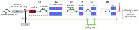The basic scheme is shown in Figure 1. A slotted foil [27] is inserted in the last bunch compressor section of the PAL-XFEL linac. The foil spoils the electron beam emittance in the head and tail parts of the bunch and suppresses lasing there. Note that the slot is set relatively wide in our scheme because its function is not to shorten the pulse length as in the original proposal but to set a defined temporal window of lasing and define the lasing domain in the electron bunch [29]. The next is the ESASE [20] section that consists of an optical laser, a modulator, and a magnetic chicane for the density modulation of an unspoiled part of the electron beam at the end of a linac section (Figure 1a). In this ESASE section, the electron beam is energy-modulated in a strong magnetic field modulator via the interaction with a co-propagating laser. The shape of the optical cycles of the pulse is replicated in the energy distribution of the electron beam. Later, a magnetic chicane converts the energy modulation to a density modulation so that the flat current profile changes into a profile of current spikes. The electron beam with these current spikes is sent to an undulator (Figure 1b) for radiation generation. The SASE undulator is made by three undulator modules (UMs). The length of the undulator is kept short to avoid saturation and to keep the electron-beam energy spread at a minimum.