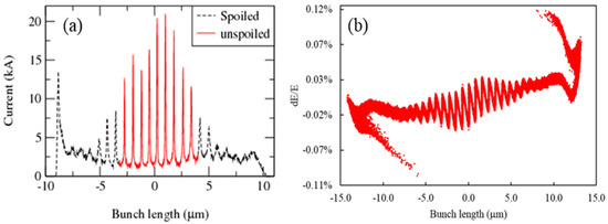 For the energy modulation of an electron beam (Figure 1a), an 800 nm, 30 fs, and 50 GW laser is used inside a two period modulator with a wiggler period of 50 cm; the density modulation is generated by a magnetic chicane with a time-of-flight parameter R56 of ~0.16 mm. The generated current distribution after these two processes is shown in Figure 3a: several current spikes with different magnitudes at an average background current of 2 kA. Figure 3b shows the corresponding plot in the longitudinal phase space after the energy and current modulation of a 10 GeV electron beam. Note that the current spikes are larger by a factor of approximately 8 compared to the background current. Note also that the window for the lasing section of the current profile can be controlled by the slotted foil system [27]. The red line in Figure 3a is the unspoiled section of the electron bunch, which is fed to UMs to generate an X-ray pulse at a photon energy of 12.4 keV. The nine current spikes in total are considered. These spikes radiate strongly in an undulator. Usually, the advantage of operating an FEL with a high peak current is the increase in X-ray output power. However, high current spikes also suffer from the energy spread, which is taken into account in this calculation. In Figure 3b, one can see that the increase in peak currents is accompanied by corresponding increases in the peak–peak energy modulation depth.