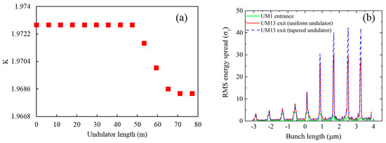 A stepwise tapering (Equation (1)) is applied along UM7-UM13 modules of the soft X-ray undulator to maximize the radiation power. Figure 8a shows the tapering of parameter applied along the undulator in the soft X-ray case. Optimal values for the soft X-ray case are as follows: = 1.8940, = 6, and and are optimized by multi scans to maximize the output radiation power. Figure 8b shows the electron-beam energy spread at various places: the black line at the entrance of the undulator, the blue-dotted line at the undulator exit in the uniform undulator, and the red line at the undulator exit in the tapered undulator.