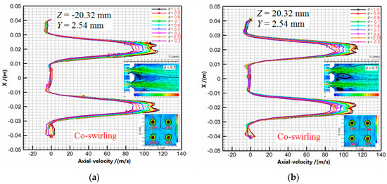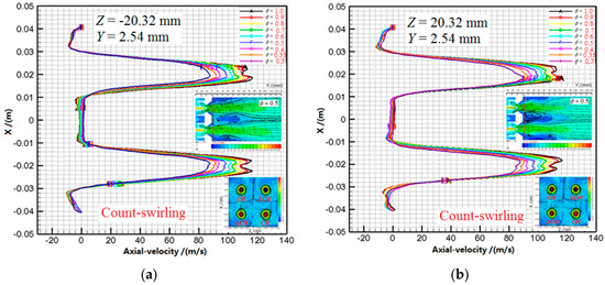 The co-swirling and count-swirling four-point LDI combustors with different equivalence ratios (0.3–1.0) were simulated with H2/Air skeletal and reduced reaction mechanism. The flow and combustion characteristics of the four-point LDI combustors are now discussed. Figure 4 and Figure 5 show axial velocity profiles in line, crossed with two planes, which are the center plane through the axis and the axial planes located at 2.54 mm, 20.32 mm, 81.28 mm, namely Z = −20.32 mm plane, Z = 20.32 mm plane, Y = 2.54 mm plane, Y = 20.32 mm plane, Y = 81.28 mm plane. Axial velocity profiles and contours present that the flow field of each swirler centerline is slightly asymmetrical. There are two asymmetrical recirculation zones near the two side walls of the combustion chambers. There are four interaction vortexes between four array swirlers. Axial velocity profiles are double-peak shaped which looks like a hump. Through reducing the fuel mass-flow rate to decrease the equivalence ratio, the axial velocities along the centerline are decreased. The axial velocity distribution is irregular and presents in a three-dimensional shape. The axial velocities are highest along the centerline of the combustion chamber. The fuel and airflow would be in the center of the combustion chamber which is induced by the velocity distribution. The distribution would result in the flame and high temperature zone being lengthened and moved backward.