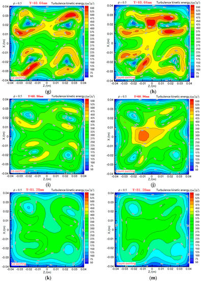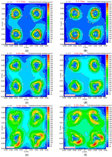 Figure 6 shows the turbulence kinetic energy contours of the co-swirling and counter-swirling four-point LDI combustors with an equivalence ratio of 0.5. There is no interaction between swirler–venturi at Y = 2.54 mm plane of co-swirling and count-swirling four-point LDI combustors. The individual flow field of each swirler–venturi is presented, respectively. The turbulence kinetic energy is highest at swirling flow fan of four-point LDI combustors. While at Y = 10.16 mm plane of co-swirling and count-swirling four-point LDI combustors, the interaction of turbulence kinetic energy between the four swirlers begins to emerge and the intensity of the count-swirling LDI combustor is slightly more than that of the co-swirling LDI combustor. For co-swirling and count-swirling four-point LDI combustors, the interaction of flow field between the four swirlers could be neglected before Y = 10.16 mm plane, only there are interaction effect in downstream flow field. While at Y = 20.32 mm plane of co-swirling and count-swirling four-point LDI combustors, the interaction of flow field between the four swirlers increases. The interaction of co-swirling LDI combustor is obviously less than that of the count-swirling LDI combustor. With the swirling flow running downstream, there is acute interaction effect between the swirlers of the four-point LDI combustor at Y = 40.64 mm and the turbulence kinetic energy is highest at the interface of the swirlers. The turbulence kinetic energy of count-swirling four-point LDI combustor is higher than that of the co-swirling four-point LDI combustor. This indicates that the count-swirling is available to improve the rapid mixing for combustion. When at Y = 60.96 mm of four-point LDI combustors, the highest turbulence kinetic energy locates at the center of the LDI combustor; this is because the spinning air from swirlers are colliding in the center of the count-swirling four-point LDI combustor. When at Y = 81.28 mm of four-point LDI combustors, the turbulence kinetic energy contours of the co-swirling four-point LDI combustor and the count-swirling four-point LDI combustor begin to be uniform and the turbulence kinetic energy also decreases. When at Y = 101.6 mm of four-point LDI combustors, the turbulence kinetic energy is further weakened and tending toward uniformity. The turbulence kinetic energies of the co-swirling four-point LDI combustor and the count-swirling four-point LDI combustor are completely uniform. The different swirler arrangements for the four-point LDI combustors would result in there being different distributions of turbulence kinetic energy. This would affect the fuel-air distributions of the primary combustion zone to induce the temperature difference, which is a disadvantage for reducing the NO emission.