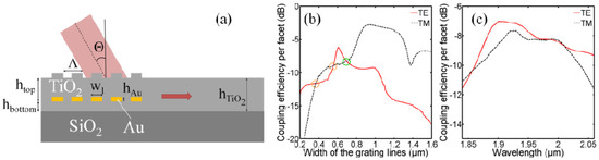 However, contrary to Reference [25], our aim is not to reach the best coupling efficiency. Here, we tried to find numerically the geometric parameters that allow a fair coupling efficiency in both the TE and TM modes for a slab. From the previous optimization, the top layer should be 234 nm and, given that hbottom = 70 nm, the total TiO2 thickness considered is 304 nm. The thickness of the gold lines hAu is chosen to be 56 nm, while the period Λ = 1900 nm. To adjust the efficiency of the TM mode compared to the TE mode, we adjust the filling factor by sequentially varying the width w1, as shown in Figure 1b. It appears that three values of w1 allow a similar coupling for the TE and TM modes, but the width of the grating lines that gives the best efficiency (−8.5 dB) is around 700 nm.