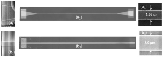 As mentioned previously, we fabricated two structures of interest (Figure 3): an MM waveguide (with a width of 8 µm) and an SM waveguide (slightly overexposed leading to a width of 1.65 µm).