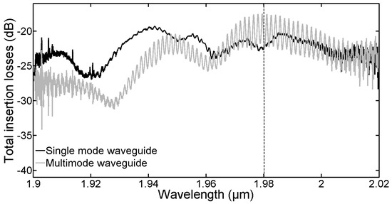 We then characterized the coupling efficiency of the waveguides with a setup similar as in Reference [25]. Two focusers oriented with an angle of 30° were used to inject and collect the signal at the input and output gratings, respectively. The injection of light emitted by an amplified spontaneous emission (ASE) source spanning from 1900 to 2050 nm was adjusted (thanks to two cameras operating in the visible and 2-µm ranges (model Xeva 2.35-320, Xenics nv, Leuven, Belgium). After transmission in the waveguide and decoupling by the grating, the output light was collected by a lensed-fiber focuser and recorded with an optical spectrum analyzer (OSA) (model AQ6375B, Yokogawa Electric Corporation, Musashino, Japan). Figure 4 shows the total insertion losses as a function of the injected wavelength for the two waveguides under test. Note that those transmission spectra are normalized with respect to a reference spectrum obtained by optimizing the light collected by the output focuser after specular reflection of the incident light onto a gold mirror [25]. It is noted that, in Figure 4, oscillations of high amplitude and short period are particularly marked for the large waveguide. These spectral oscillations are attributed to a Fabry–Perot effect, the spectral range between two maxima being in agreement with what can be expected from the roundtrip distance. The experimental loss should be twice as large as the value expected from our numerical simulation (Figure 1) performed for one facet, given that we neglect the propagation loss. Then, the discrepancy between the numerical simulations and the maximum experimental efficiency is about 3 dB, mainly attributed to the strong dependency on the width of the grating lines and also probably due to fabrication issues (in particular related to the roughness). Even though, for the MM waveguide configuration, the TE mode was expected to be as efficient as the TM mode for a grating line width of 700 nm, here it was the case for w1 = 630 nm. Regarding the TE SM waveguide, as expected, the coupling efficiency is similar to the one obtained for the large waveguide. Let us once again recall that a (6 dB) better efficiency can be reached for optimized parameters, but our goal here was to establish a fair comparison between the MM and SM components.