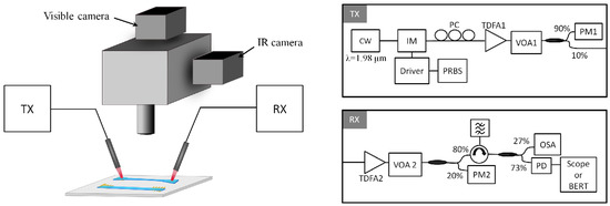 In order to demonstrate the suitability of our TiO2 devices for 2-µm optical communications, we implemented the experimental setup detailed in Figure 5, based on 2-µm commercially available devices. The transmitter (TX) was based on a laser diode centered at 1980 nm and was intensity modulated by means of a commercial Niobate–Lithium modulator (model MX2000-LN-10, iXblue Photonics, Besançon, France). The Non-Return-to-Zero On-Off-Keying signal under test was a 231–1 pseudorandom bit sequence (PRBS) at 10 Gbit/s. Since the SM waveguide is polarization-sensitive, a polarization controller was used after the intensity modulator. Then, a thulium-doped fiber amplifier (TDFA) was used before a 90/10 coupler, allowing us to monitor the power injected into the waveguide. Note that the variable optical attenuator is usually implemented just in front of the receiver, but due to limited sensitivity of the available power meters working at 2 µm, it was more convenient to insert it before the waveguide.