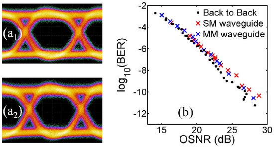 The quality of the transmission through the TiO2 waveguide was more quantitatively evaluated through systematic measurements of the Bit-Error-Rate according to the OSNR on the receiver. The results obtained for the various configurations are summarized in Figure 6b. From a general point of view, the global trends are very similar, with very moderate penalty (~1.5 dB) obtained after transmission through the waveguides and compared to the back-to-back configuration for BER lower than 10−8. Moreover, no significant difference was observed between the SM and MM waveguides. Therefore, for the length of propagation under consideration, the multimode nature of the waveguide does not seem to impair the transmission quality.