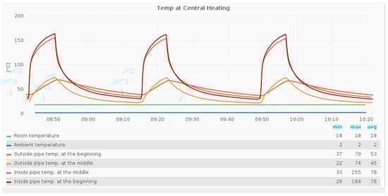 Visible are the aforementioned temperatures and an approx. 20/80 on/off behavior of the heating. The outside temperatures of the pipe have their maximum at about 74 °C, whereas the inside pipe temperatures reach a temperature of 163 °C. For the time being, the temperature levels seem to be appropriate to install a TEG-based EHS.