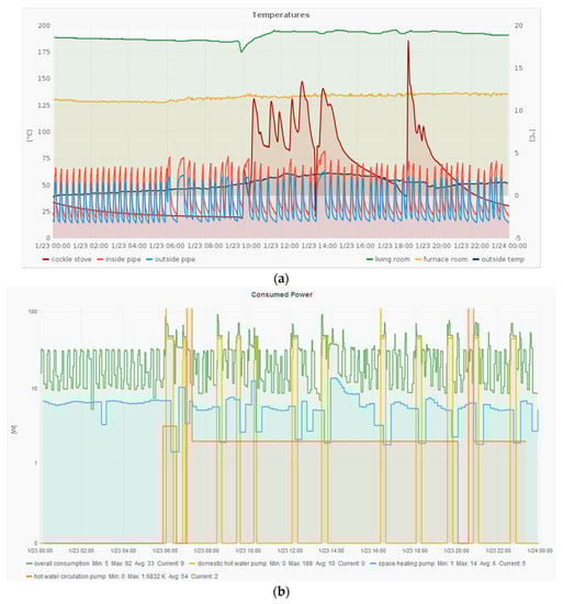 Measurement in a private house: (a) Measured temperatures at the heating and the cockle stove; (b) Power consumptions of the pumps in the heating.