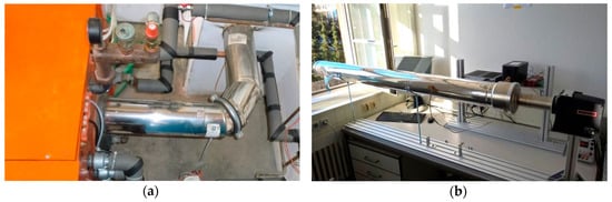 To avoid disturbing a real heating system, a heating mockup was planned and finally built-up in our laboratory. As a heat source for the heating mockup, an industrial hot air blower is used, at which the temperature and the velocity of the air can be controlled. The dimensions of the exhaust gas pipe correspond to reality. The real heating system on the campus is shown in Figure 3a and the heating mockup is shown in Figure 3b.