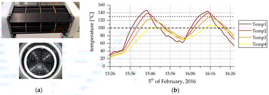 Concerning the thermal design, a segment cooling aggregate, [], which is originally designed to cool down a flowing medium, is installed in the exhaust gas pipe. It is built up of cooling elements, which penetrate into the medium, collect the heat and transport it to the outer side of the pipe, see Figure 5a. There, the TEGs and the corresponding cooling units can be easily attached. This component is used to collect as much heat as possible from the exhaust pipe (the heat of the medium). This is, of course, an intervention in the real process and that is why a heating mockup was planned and finally built-up in our laboratory. Consequently, all following results are valid for a hot flowing medium in a pipe, but cannot be transferred directly to a real system, e.g., a real heating, before doing more studies on the influence for the real process. First measurements on the mockup with the installed clean segment cooling aggregate and a real heating behavior are shown in Figure 5b. The temperatures for each section of the segment cooling aggregate—in total there are four sections—are measured.