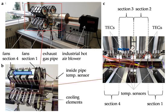 At each section, four thermoelectric devices can be attached, which are consequently under the same temperature conditions. In [], it was shown that in some cases expensive TEGs can be replaced by cheap thermoelectric coolers (TEC, Peltier element). According to [], for the first two sections, TEGs are used and TECs are used for the third and fourth sections.