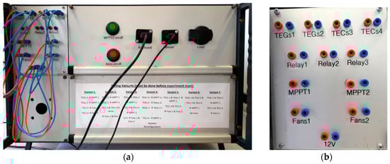 Regarding the last hardware point of the development process, the electrical design, the prospective was to be very flexible. That is why a switch cabinet with a front panel was built up (see Figure 7a). As the thermoelectric devices of one section have the same temperature differences, they are connected in parallel. The individual blocks can then be individually interconnected (see front panel in Figure 7b). There are different connection possibilities, e.g., TEG blocks in series or in parallel or a mixture of both, connecting them to one or two MPPTs, connecting some TEG blocks with the fans or supplying the fans over a 12 V power supply. Beneath the front panel, the switch cabinet also includes an industrial PC to control the hardware setup via the LabVIEW program, an accumulator, the two MPPTs, the 12 V power supply, some relays (for system reconfiguration during operation mode; condition: all TEG blocks in series and between the relays), a vehicle plug to connect different loads as well as different measurement devices. All the measurement data are also written in the database and can be visualized by the previously mentioned web interface. The following measurements are carried out:
