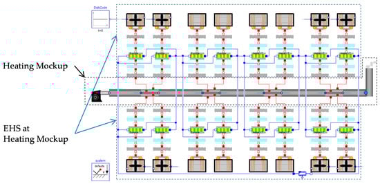 To simulate thermoelectric EHSs, a Modelica library called EHSTEG (Energy Harvesting Systems based on Thermoelectric Generators) was developed and applied; more information about the modeling of TEGs can be found in [,]. With this library, a complete system can be reproduced and this is also done for the heating mockup with the attached EHS (see Figure 8). The advantage with Modelica is that graphically, it looks very similar to the real system, which makes it easily usable and ensures that different physical principals can be simulated in one simulation environment (electrical, thermal, and so on). Visible in Figure 8 is the heating mockup consisting of the hot air blower, the exhaust gas pipe and the segment cooling aggregate components. The EHS is presented in the simulation model by heat transfer paste (grey components), air gaps (pale blue components), the TEGs/TECs represented by the yellow/green components as well as the cooling elements with and without fans. The blue connection lines present the electrical wiring between the thermoelectric devices, which can be adapted to the real wiring at the front panel. In the simulation model, the measured hot medium temperatures of the real heater, which are stored in the database, act as simulation input.