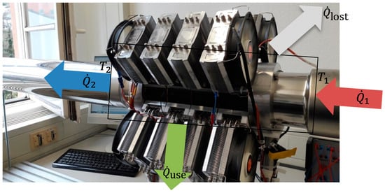 The temperatures  and  as well as the mass flow rate  are measured or calculated values, whereas the specific heat capacity  of the medium can be taken from the simulation. Thus, the useful heat rate here is approx. 560 W at the peaks, cf. Figure 9. The produced power is 2 W and so the efficiency is about 0.36%, according to the following equation:
