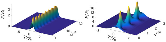 There is a threshold value of N to generate a soliton. As long as , all energy goes into radiation. At , the radiative part dips to zero. At , it reaches the same energy as at again, and that suffices to generate a second soliton. At , there is a combination of two solitons without any radiative part. This structure, for which an explicit expression was already given in [6], is called an soliton (Figure 2 right). More generally speaking, for any , , one has a so-called higher-order soliton of order N in the pure form, i.e., without radiation. An explicit expression for the case solitons was found in [11]. The power profile of all higher-order solitons oscillates with period . For all non-integer values of N, there is a radiative contribution.