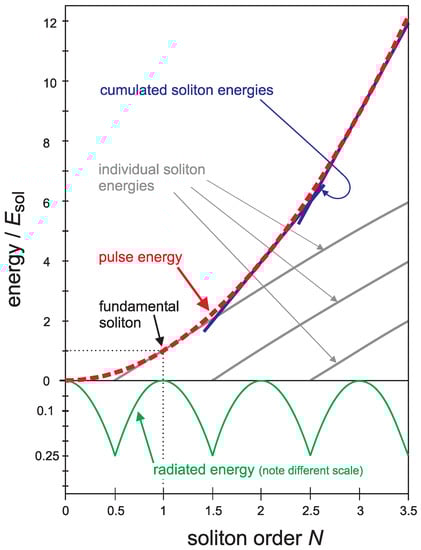 Figure 3 gives an overview of this situation. In its upper part, the pulse energy according to Equation (7), shown in units of , is represented by the dashed parabola. Beginning at , the first soliton appears. Its energy then rises linearly and passes through unity at . Similarly, at other half-integer values of N, more solitons begin, each of them contributing energy to a cumulative value shown in blue. The latter is tangent to the parabola at integer N values; here, the individual soliton energies are also integer in units. They take the first N values of the sequence , which add up to . For all non-integer N, there is a gap between the cumulative solitonic and the total energy, which represents the radiative part of the energy. Radiation energy is shown in the figure’s lower part on an inverted, magnified scale (green curve). Whenever, at some half-integer N, it reaches , the next soliton is created. Always the integer number closest to N determines the number of solitons involved, while the fractional part determines the amount of radiation created along with them.