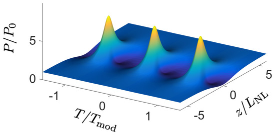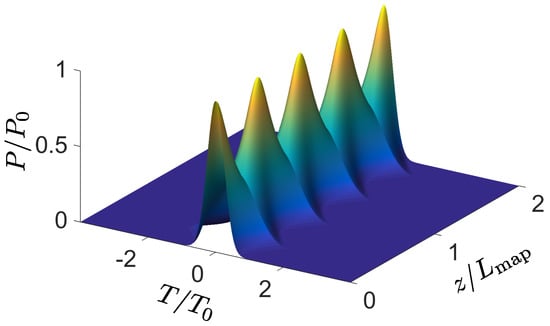 The propagation of a fundamental soliton with is shown in Figure 1. As the temporal evolution (sech term) does not contain z, the temporal shape does not change during propagation. Without nonlinearity, the shape would change appreciably after one dispersion length . The other relevant length scale is the nonlinearity length after which self-phase modulation becomes appreciable. As Equation (4) shows, for the soliton . This equality expresses the balance between both.