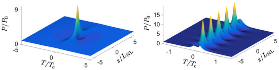 This is a structure that is localized in both time and space, known as the Peregrine soliton [20]. It is shown in Figure 5 (left); a first experimental demonstration was given in [21]. A further member of this family of NLSE solutions was studied in [22] and is known as the Kuznetsov–Ma soliton. Mathematically, that solution is described by the modulation term:
