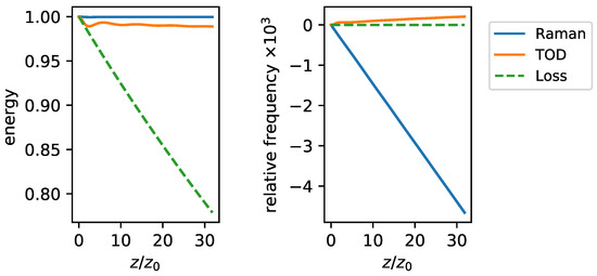 The loss term contains Beer’s loss coefficient ; the impact of the loss can be characterized by the characteristic loss length . As long as the loss is weak, i.e., , the equilibrium of dispersive and nonlinear effects that characterizes the soliton is only mildly perturbed. In that situation, the soliton can rearrange its shape: With the peak power drooping and the width increasing slightly, Equation (4) can still be approximately fulfilled even when the energy is reduced [29,30].