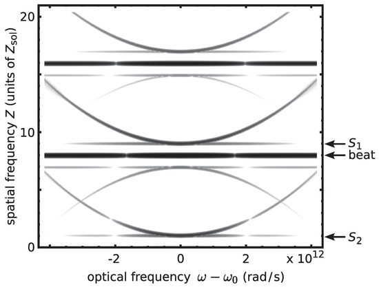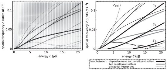 no analytical result is known to the authors’ best knowledge. Instead, approximate solutions can be found numerically. As an example, when setting and choosing and according to Equation (4), DST reveals that the pulse consists of two solitons and a small amplitude radiation part of nontrivial spectral shape (see Figure 8).