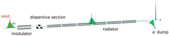 Sketch of the High Gain Harmonic Generation (HGHG) free electron laser (FEL) configuration. Seed laser pulse and electron beam are superimposed in a first undulator indicated as modulator. The FEL interaction induces an electron energy modulation with the periodicity of the seed wavelength. The dispersive section converts this energy modulation into a density modulation containing higher order Fourier components of the original modulation. One of these components is finally amplified in the radiator.