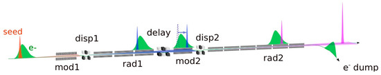 The amplitude of the energy modulation necessary to initiate the HGHG process grows with the order of the harmonic conversion. The induced energy dispersion has a detrimental effect on the high gain amplification in the final radiator, for this reason the design of FEL-1 relied on harmonic conversions up to harmonic 13. During the last years of operations, we have demonstrated the ability to operate the FEL at even higher harmonic orders with reduced performances, e.g., up to the 20th harmonic, but substantially higher orders can be reached with a double stage HGHG cascade, where the harmonic conversion is repeated twice. The double conversion is done with the fresh bunch injection technique [17,18] on FERMI FEL-2 [19], shown in Figure 2. The FEL is composed by a first stage, analogous to FEL-1 (see Figure 1), followed by a delay line, a magnetic chicane slowing down the electron beam with respect to the light pulse generated in the first stage. The light pulse from the first stage is shifted to a longitudinal portion of the beam unperturbed by the seed in the first stage. In this way the light from the first stage functions as a short wavelength seed for the second stage. This scheme was implemented for the first time on FERMI FEL-2 and was used to demonstrate the seeded FEL coherent emission in the soft-X rays, up to harmonic orders of 65, and more [19].