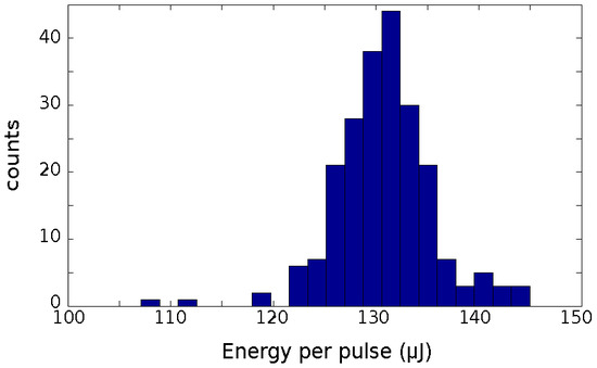 The fluctuations of the pulse energy are determined by fluctuations of the external parameters driving the amplifier, as the energy of the electron beam, the timing between electrons and seed, and the intensity of the seed itself. The energy jitter may be lower than 5%, as in the example shown in Figure 5, where the histogram of the energy per pulse from FEL-1 in optimized conditions at 51 nm is displayed. This value may be compared to the typical energy jitter of the input seed laser in the UV, which is about 1%. A typical figure for the energy jitter is 10–15% for FEL-1 and 25–35% for FEL-2 with the double cascade. In terms of temporal synchronization, the seed timing largely determines the arrival time of the FEL photon pulse. At FERMI the optical synchronization between the seed and the lasers used in pump an probe experiments, which originates from the same oscillator, is associated to a jitter between the FEL light and the other sources of about 5 fs [25]. Recent measurements have shown even lower values, below 3 fs [22].