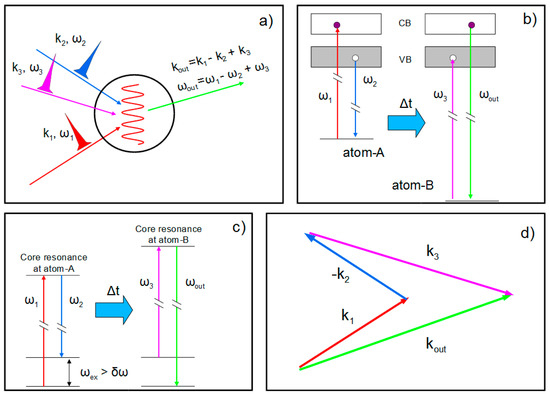 Further steps can be undertaken to make XUV/X-ray FWM experiments feasible on routine basis. One of the most useful would be to replace the optical pulse with a XUV/X-ray. This will permit to probe, via ISS-type FWM methods, low energy modes (e.g., acoustic modes) in a wavevector range (~0.1–1 nm−1) hardly accessible by both optical methods and linear X-ray spectroscopy [46]. Such a wavevector range matches the characteristic length-scales of heterogeneities in the local structures of several classes of materials (e.g., block copolymer, relaxor ferroelectrics, glasses etc.), the incommensurate dimensions of many crystalline phases showing super-lattices of different natures, as well as the characteristic dimensions and periodicities of many nanostructures. Among these applications we mention the study of acoustic dynamics in glasses, which is largely believed to be the origin of the anomalous thermal properties of glasses, still a lively debated issue [47]. A debate that essentially comes from the impossibility to fully access such a ~0.1–1 nm−1 wavevector range and from the stark disagreement often observed between the extrapolations of the trends found at lower and larger wavevectors. Also, couplings between acoustic modes and local vibrations in nm-sized elastic domains, inherently connected to the amorphous local structure, may also have a relevant role; such a small length-scale is potentially in the range of XUV/X-ray FWM. Another relevant step to extend the range of applications of FEL-based FWM is to exploit the two-color emission scheme in order to demonstrate FEL-based CRS-type experiments. This would be a major step forward towards the realization of XCRS with atomic selectivity (see Figure 9), which in many respects may be considered as a main target application of XUV/X-ray FWM.