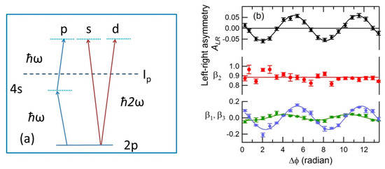 (a) Scheme of the experiment. Left: a 2p electron is excited to 4s by one photon and then emitted as a p-wave by a second photon. Right: a 2p electron process is emitted as an (s + d)-wave by a one-photon process. (b) Asymmetry parameter ALR as a function of Δϕ (black curve), and β1 (green), β3 (blue) and β2 (red) parameters as a function of Δϕ. Experimental data are shown as markers with error bars. The lines are sinusoidal or straight line fits for β1, β3, and β2 respectively.