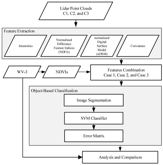 The proposed scheme utilized the concept of geospatial object-based image analysis (GEOBIA) [23] in land cover classification. Figure 3 shows the workflow of proposed scheme. The GEOBIA approach for land cover classification consists of three steps, including feature extraction, image segmentation, and object-based classification. The input data are LiDAR data from different wavelengths, and the preprocessing feature includes extraction, such as geometrical and spectral features. After selecting the training dataset, the object-based classification process applies segmentation and the SVM classifier, and the output data are the classification results from different combinations, including three combinations based on different features (Cases 1 and 2) and different data sources (Case 3). All the combinations used object-based classification to detect land cover types, and the results of all combinations were used to compare the performance of different features.