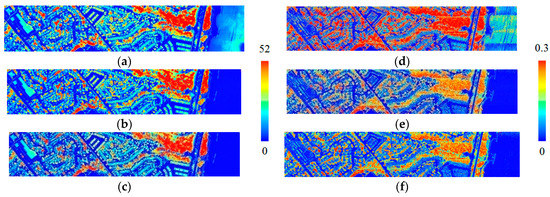 These three intensities with wavelengths of 532 nm, 1064 nm, and 1550 nm (Figure 1b–d) were stored in separated files according to the ASPRS LAS standard. The tested data contained about 14,731,124, 13,530,547, and 12,439,573 points from these three channels, respectively. The total number of points in the study area was about 40 million, and the average point density was about 70.7 pts/m2.