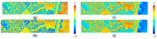 Extracted features. (a) nDSM of 532 nm channel; (b) nDSM of 1064 nm channel; (c) nDSM of 1550 nm channel; (d) curvature of 532 nm channel; (e) curvature of 1064 nm channel; (f) curvature of 1550 nm channel; (g) NDFIMIR-G image from LiDAR; (h) NDFINIR-G image from LiDAR; (i) NDVI1 image from WV-3; (j) NDVI2 image from WV-3.
