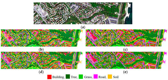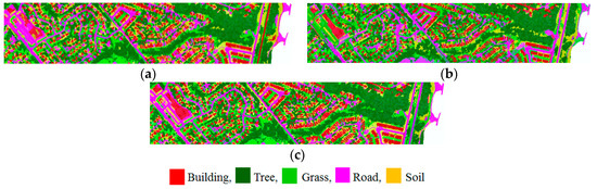 As previously described, the test area was classified into five land cover classes (buildings, trees, grass, roads, and bare soil), and the results from the four combinations were color-coded to indicate each land cover type (Figure 5).