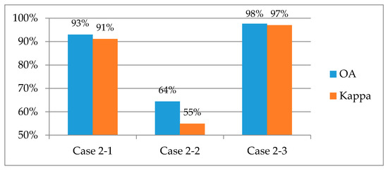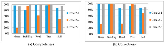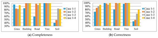 The completeness from spectral features (Case 2-1) was higher than 80% because road, soil, and grass have different spectral signatures [37]. In addition, the results of spectral features were significantly better than for the geometrical features (Case 2-2) for road, soil, and grass. The geometrical features showed higher accuracy for buildings and trees because these two objects have different roughness (i.e., curvature). Because the heights of grass, road, and soil classes are similar; these geometrical features are not easily discriminated among those objects. The integration of spectral and geometrical features (Case 2-3) improved the accuracy of these three classes from 1.7 to 75.5 percentage points.