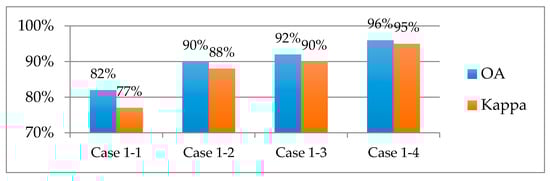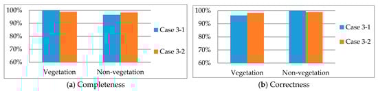 Because trees and buildings are significantly higher than other land covers, they show limited improvement when the three wavelengths were integrated. Overall, the completeness improvement from single- to multi-wavelength LiDAR ranged from 1.7 to 42.3 percentage points. In correctness analysis, the behavior of soil, road, and grass was similar to results from completeness. The multi-wavelength features (Case 1-4) also improved the correctness of these three classes from 1.4 to 35.8 percentage points. The soil and grass had a higher improvement rate when the multi-wavelength feature was adopted. The decrease in completeness is less than 2.5 percentage points between cases 1-1 and 1-4 for grass. For correctness, the decrease in accuracy is less than 0.2 percentage points between cases 1-2 and 1-4 for tree.