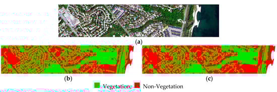 Results of vegetation detection. (a) Reference image; (b) result of Case 3-1; (c) result of Case 3-2.